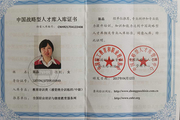 陈晶中级感统训练师
